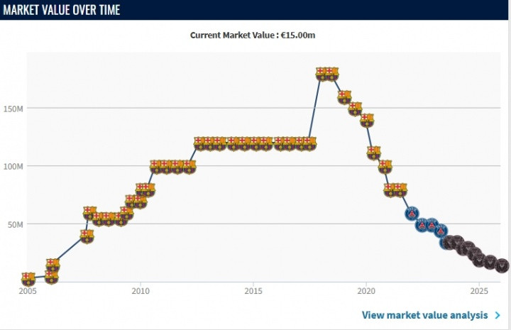 梅西生涯身价变化: 17岁出道300万欧, 30岁巅峰1.8亿, 38岁1500万